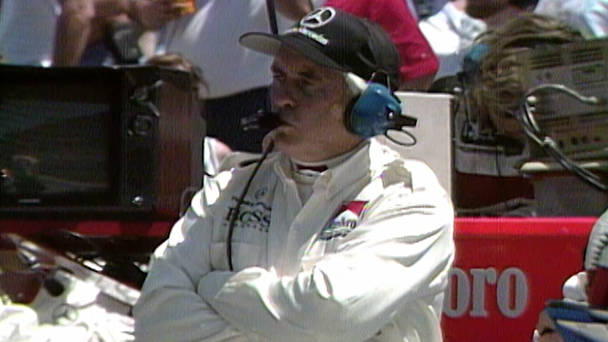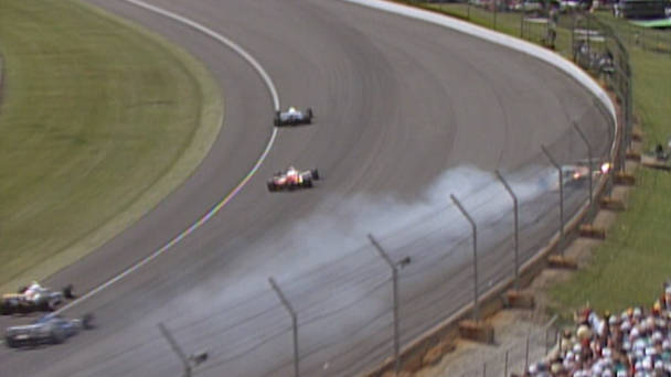 Race footage of Al Unser Jr. and eventual-winner Emerson Fittipaldi getting tangled up during the 1989 500.